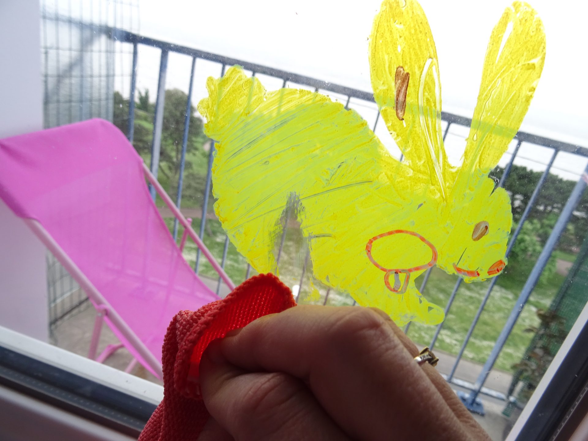 Le chiffon efface en instantané le dessin. Si le dessin est resté quelques jours sur la vitre ne pas hésiter à utiliser un peu d’eau.