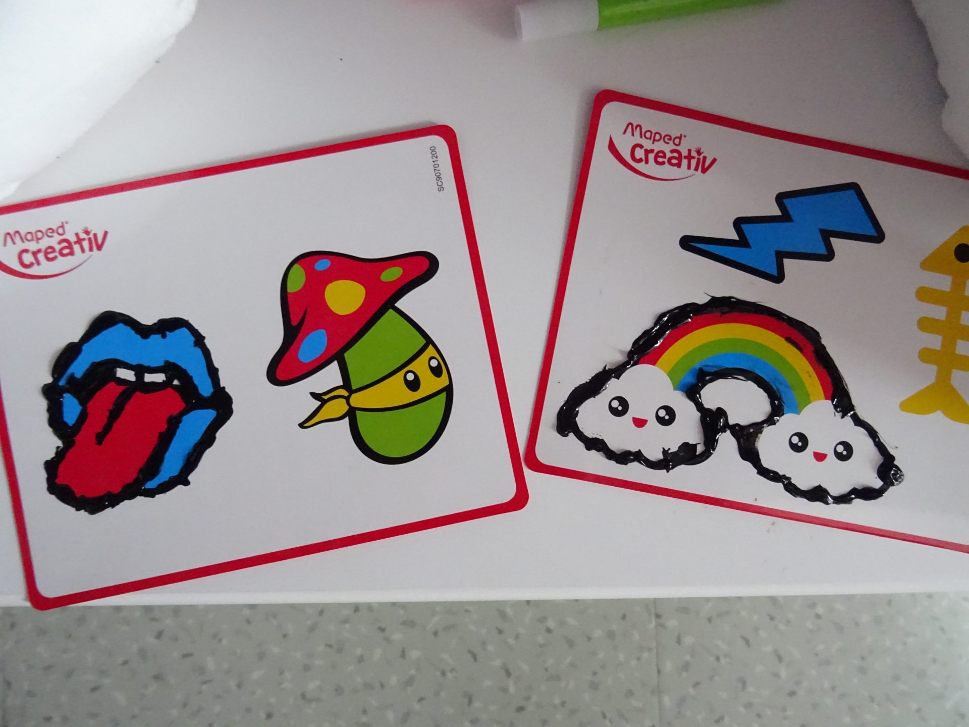 Après 2h de séchage, l’enfant peut s’adonner à toute sa créativité en coloriant l’intérieur du dessin en utilisant les gels de couleurs et en respectant les couleurs du dessin.