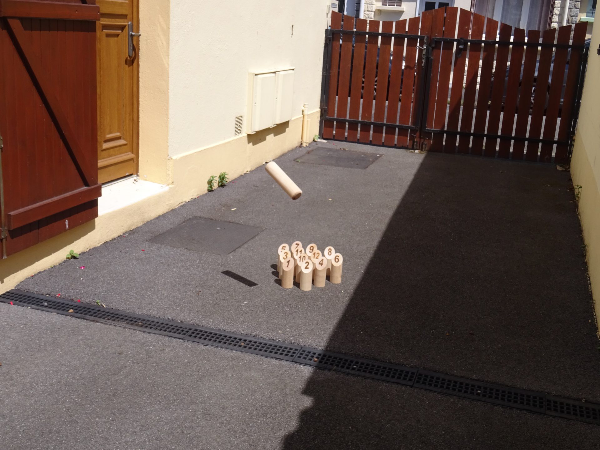 Il suffit donc de lancer le bâton en bois dans le sens horizontal afin de dégommer les quilles…
