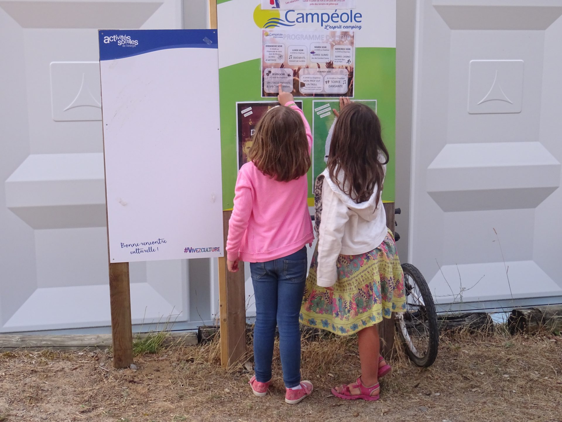 Le camping c’est aussi l’heure des retrouvailles entre enfants, chipie n’ a pas été au club enfants proposé par le camping mais s’est fait quelques copines et se retrouvaient devant le tableau d’animation chaque soir en attendant l’ouverture de la soirée !