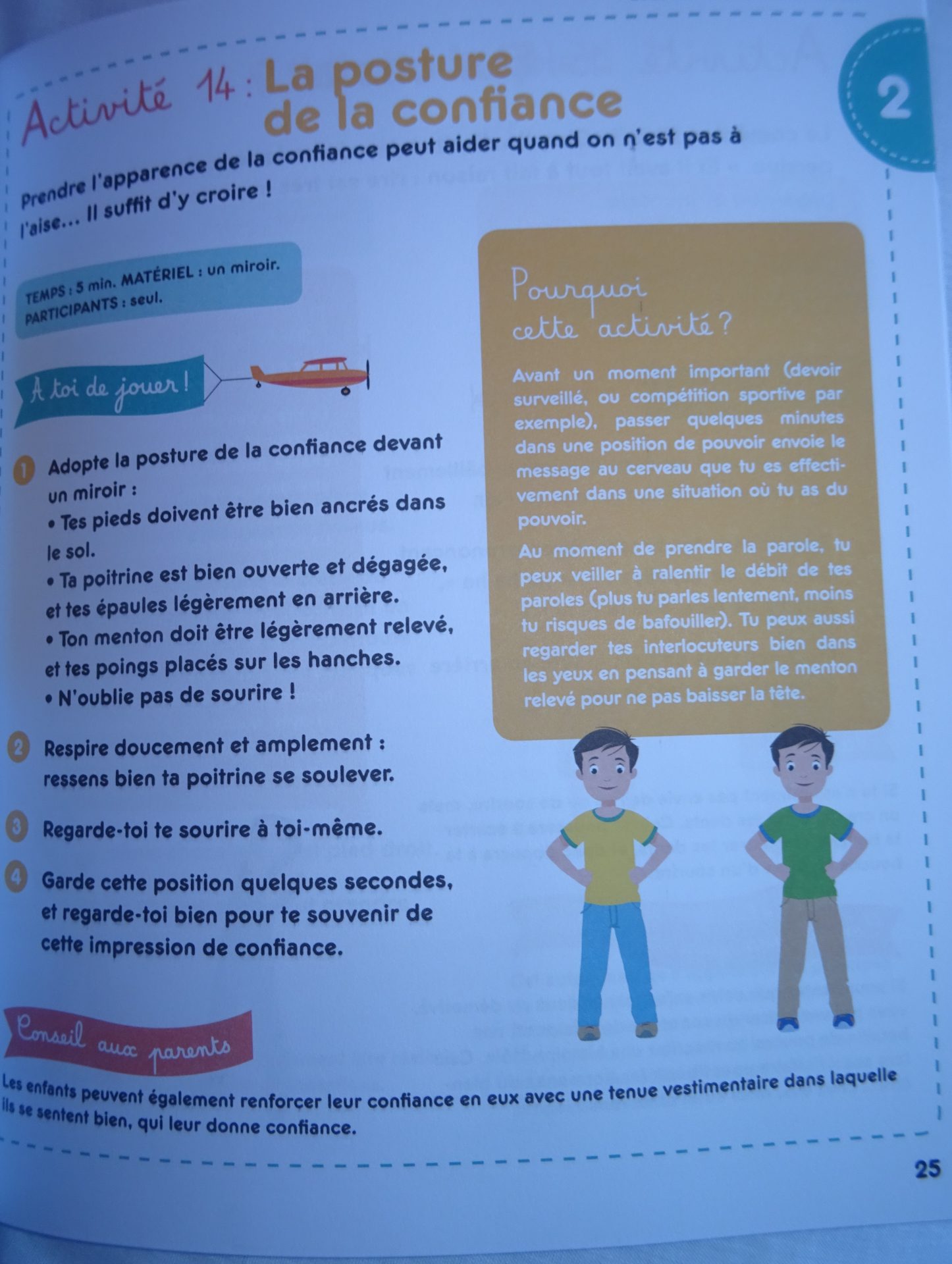 Il est possible de renforcer la confiance en soi en s’appuyant notamment sur des activités qui développent le sentiment de sécurité intérieure, la confiance en ses propres compétences et le dépassement de la peur de l’échec.