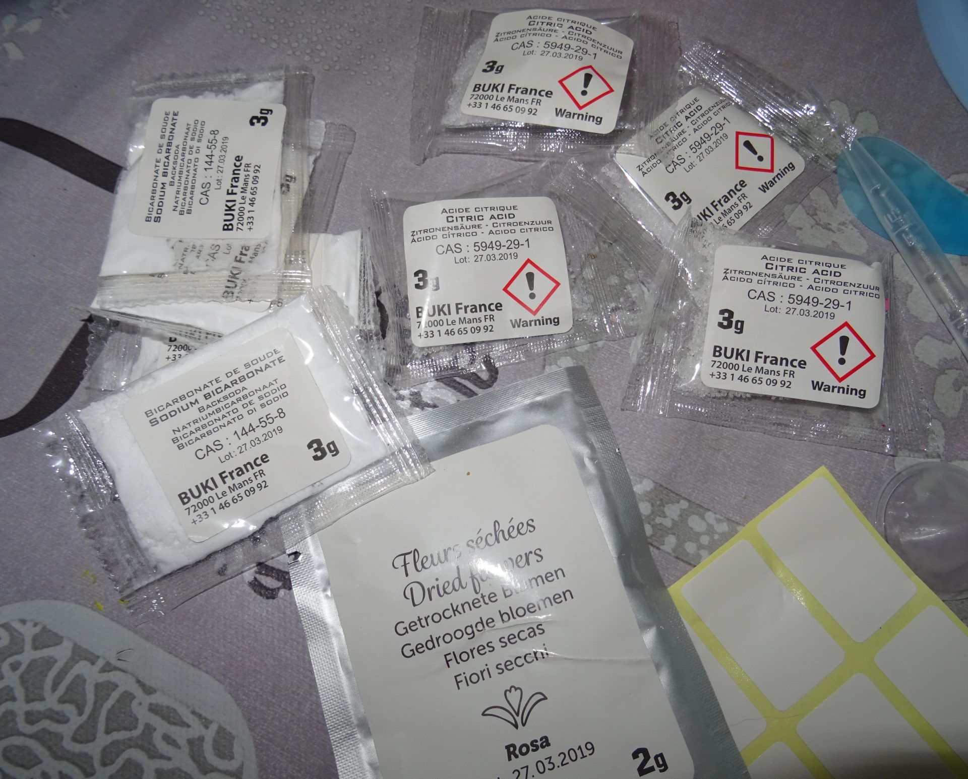 des flacons de différentes tailles, des sachets pré-dosés pour fabriquer des boules de bain, des sachets pour customiser avec des fleurs séchées ou des paillettes, des étiquettes pour identifier les produits sur les flacons, un entonnoir, des cuillères doseur, une pipette ML et la fabrique !