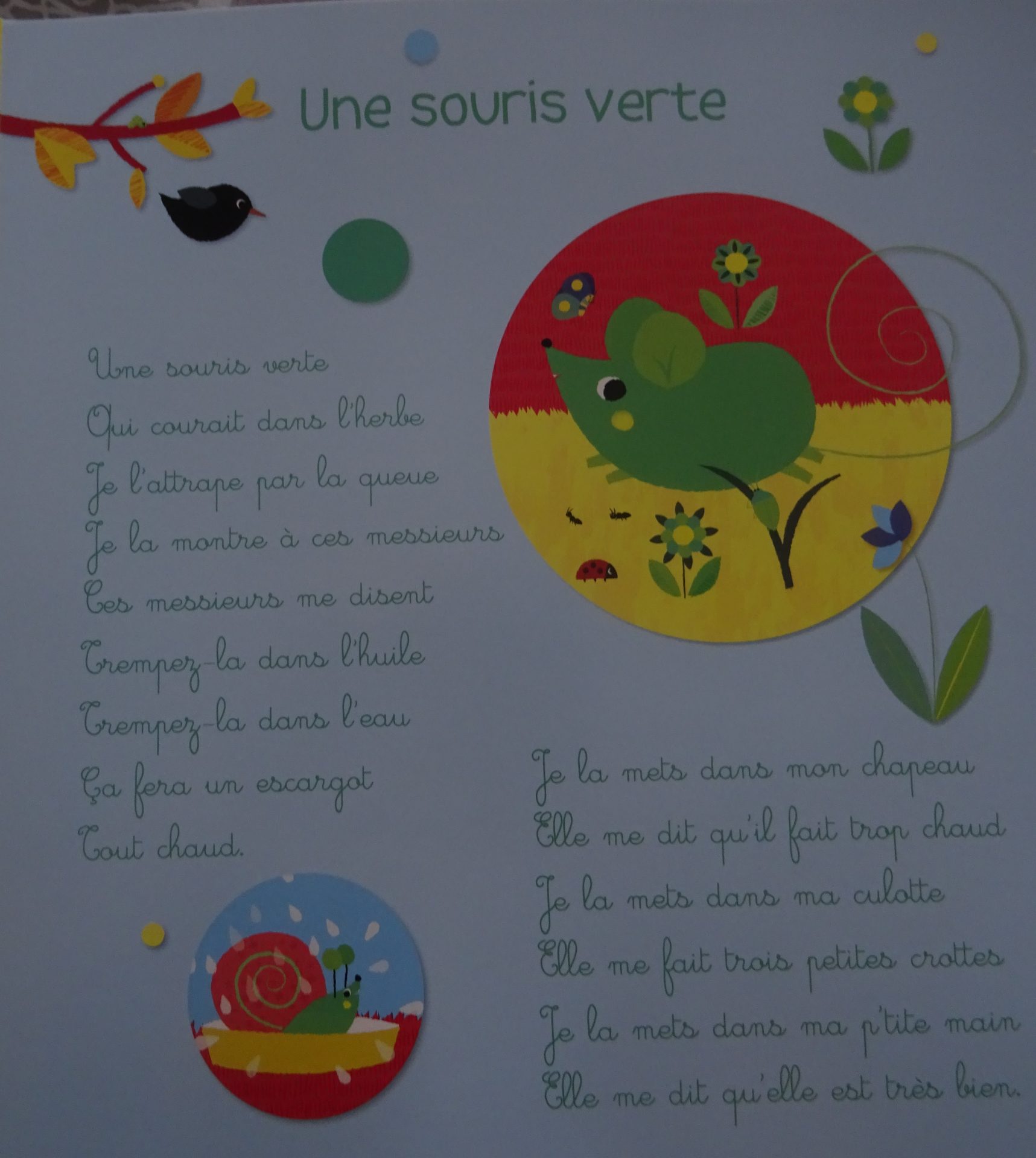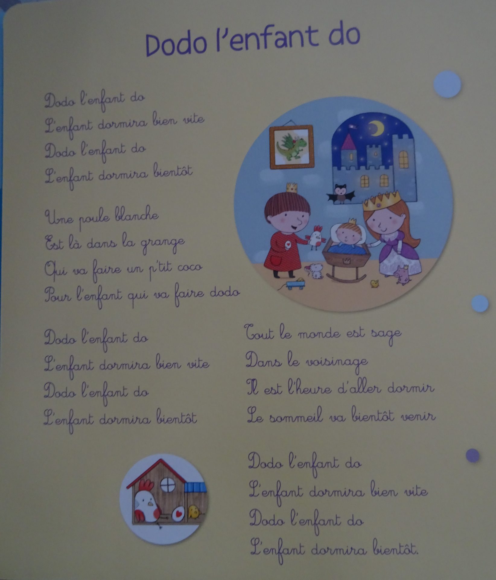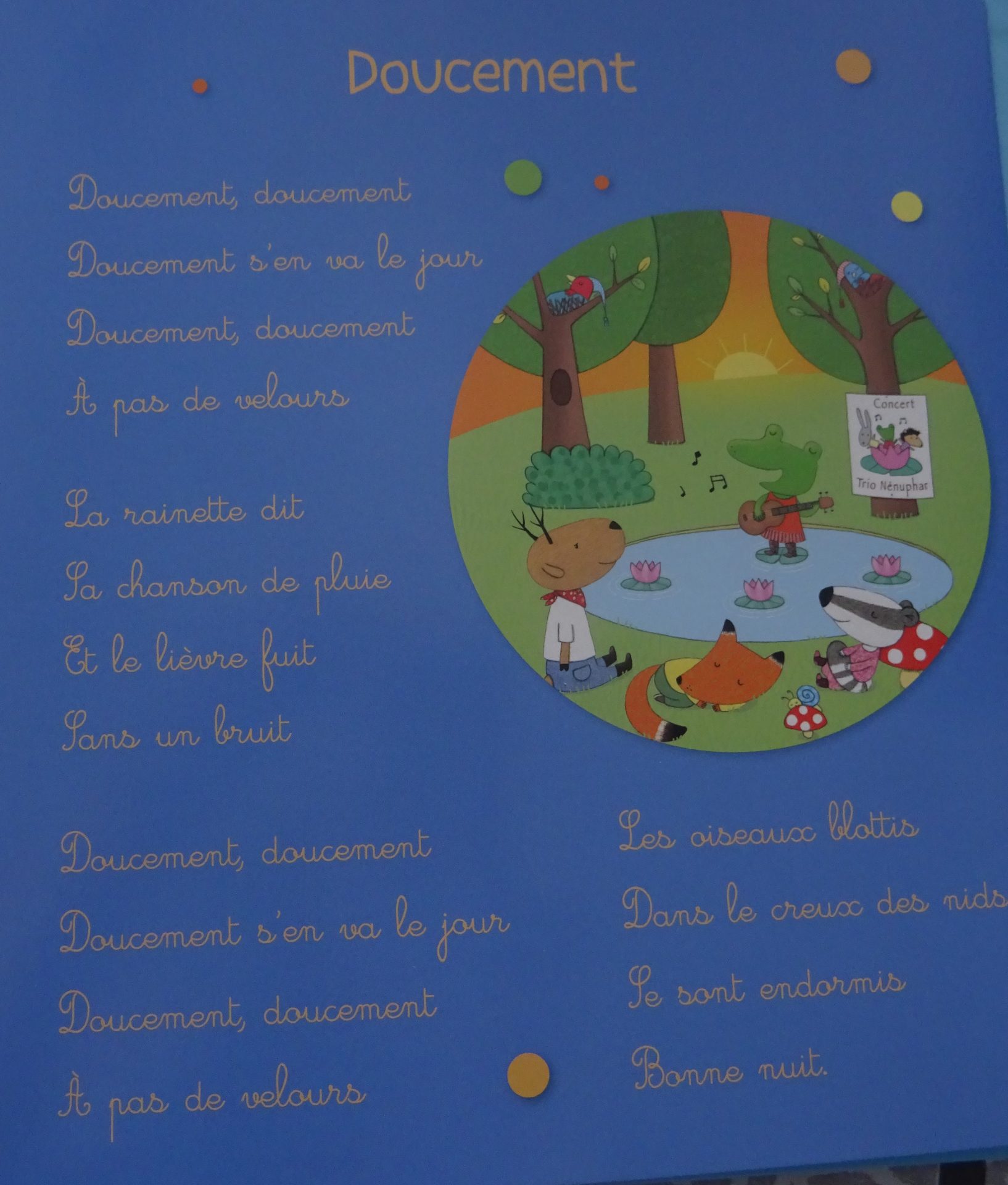 On retrouve ainsi les traditionnelles chansons et comptines « Une souris verte » ou « Les crocodiles » mais aussi des berceuses pleines de charme : « Un grain d’or » ou « Dodo l’enfant do »