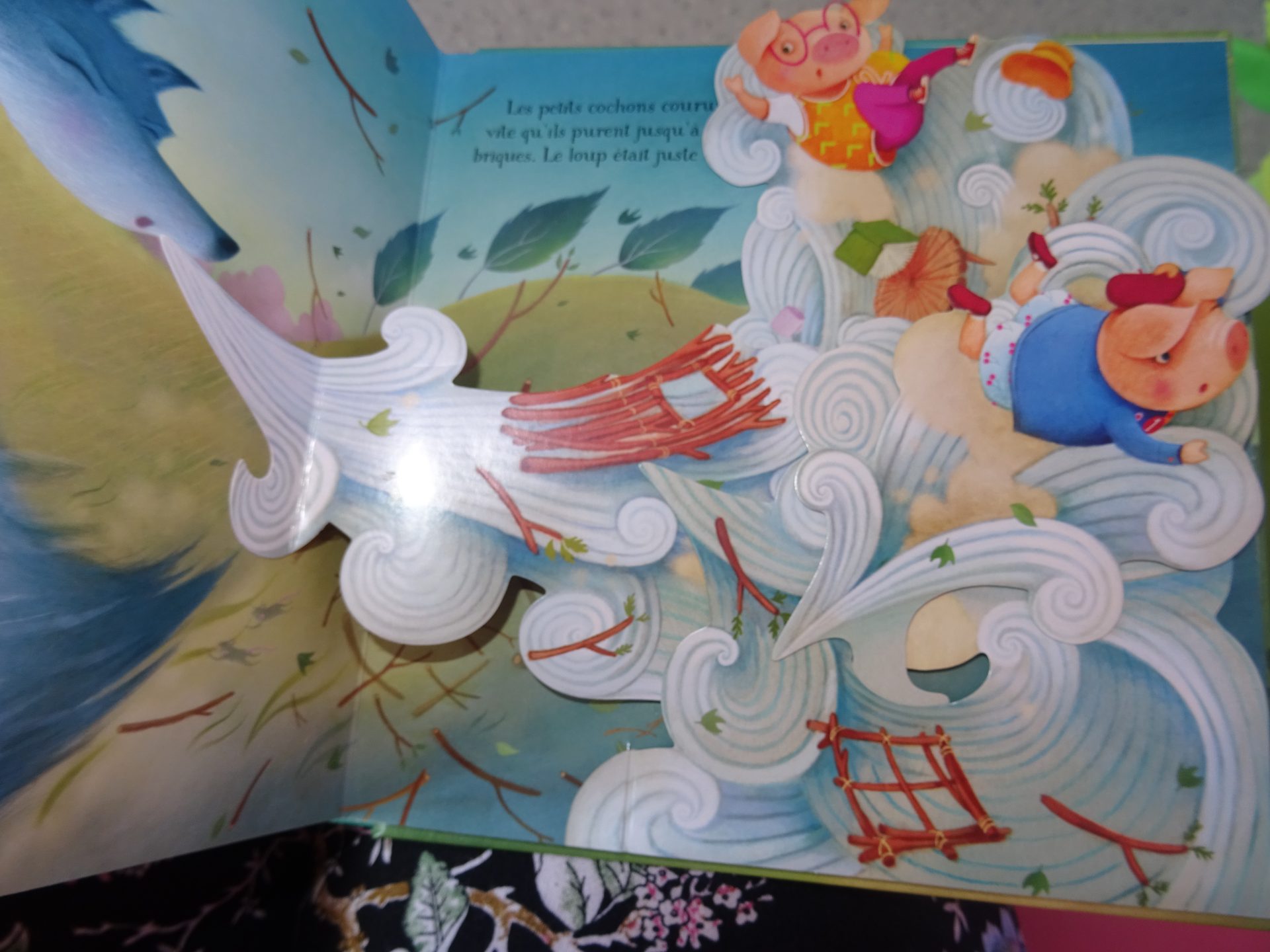 Quand la double page s’ouvre, le vent tourbillonne et nous offre un joli panorama ! Un loup qui tombe dans la cheminé et qui fait rire chipie.