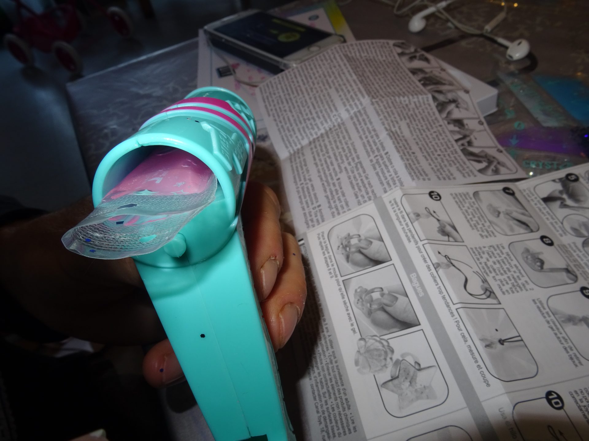 Pour commencer on choisit la couleur du gel que l’on souhaite pour le bijoux, on mélange les deux parties du gel puis on l’insère dans le pistolet.