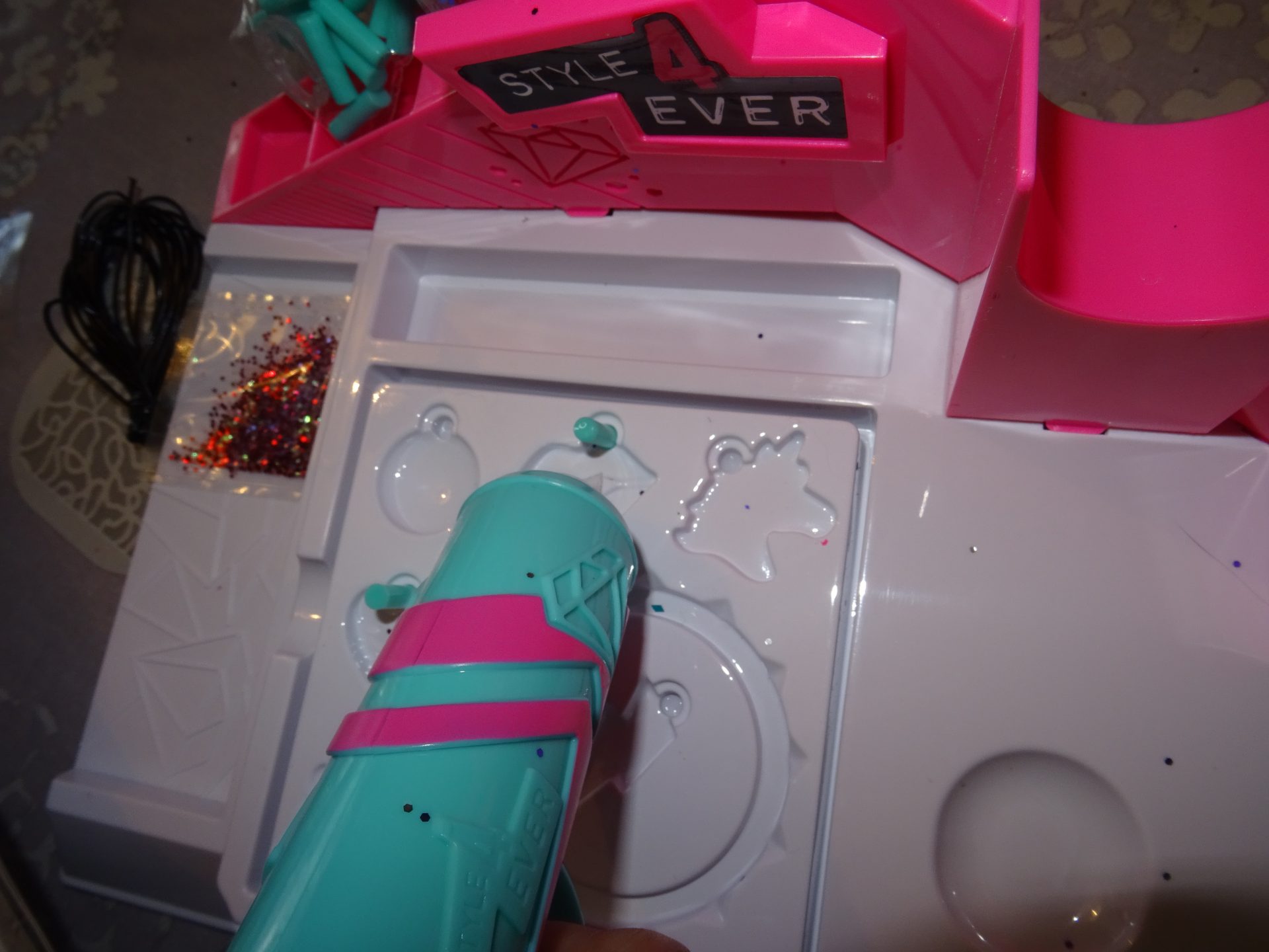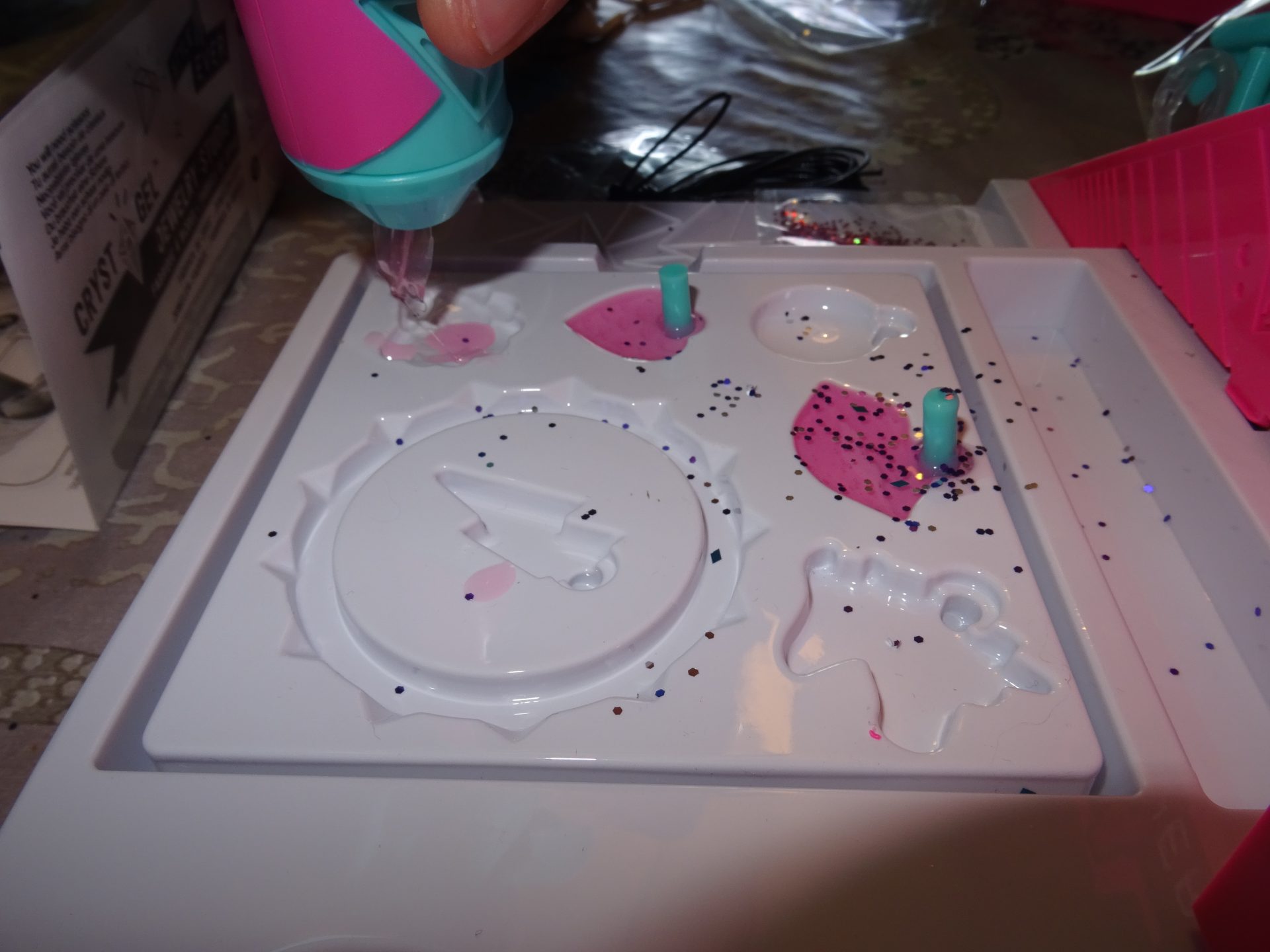 Le kit est composé de la fabrique, de moules de différentes formes, de paillettes et accessoires pour fabriquer bagues ou bracelets 😉