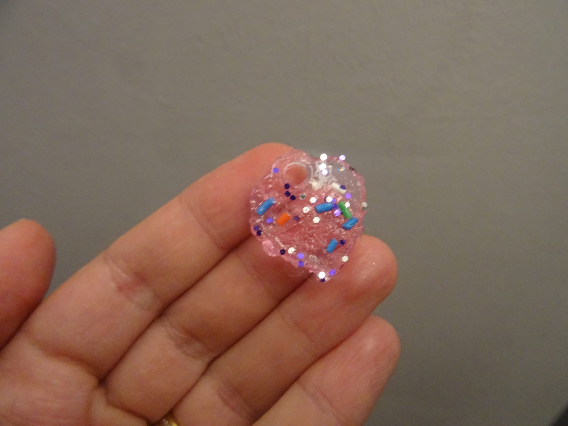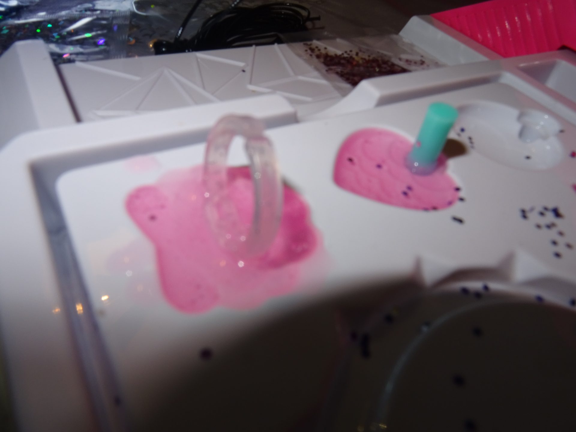 Une fois le gel moulé, on dispose soit un anneau pour la bague soit on a mis préalablement un embout pour faire le trou du pendentif.