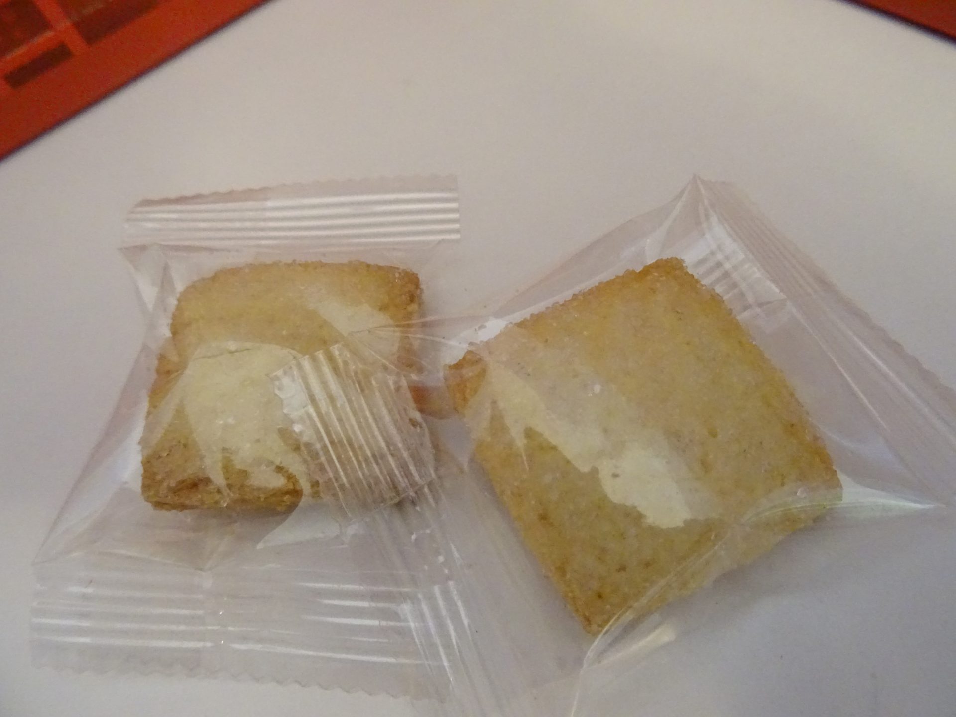 Cette boîte est garnie de sablés carré emballés individuellement.