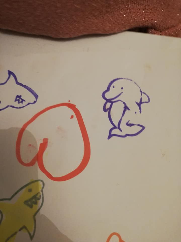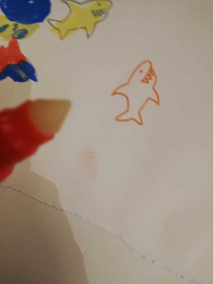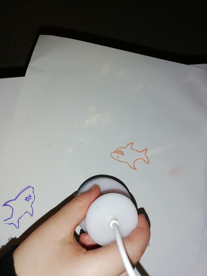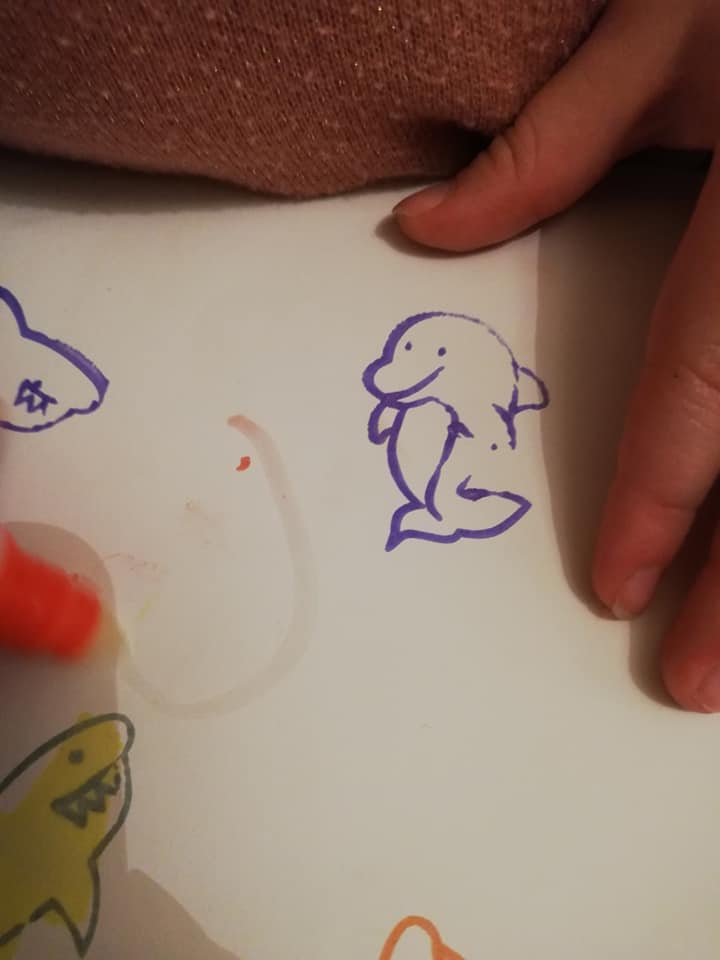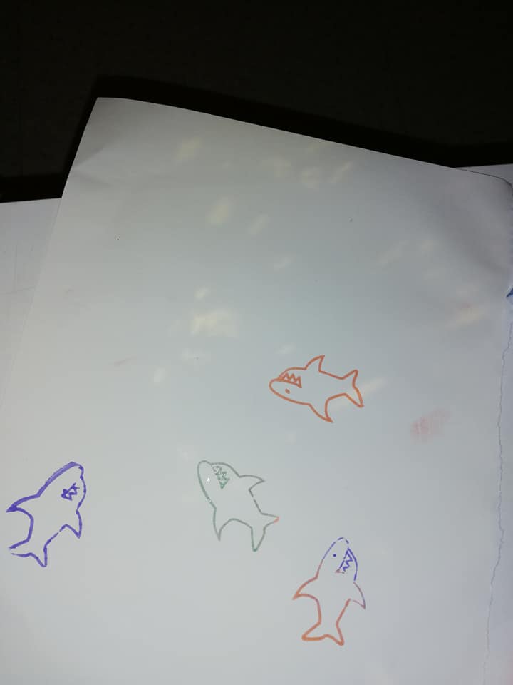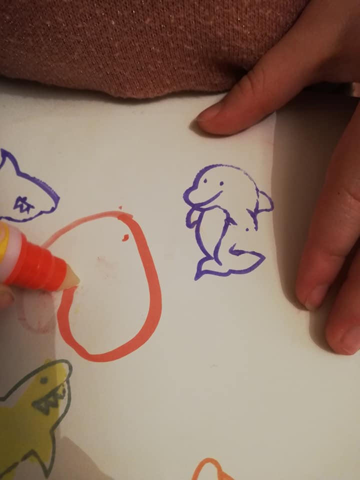 Et hop on utilise le cahier de feuilles magiques pour dessiner… Il suffit d’appuyer sur la feuille pour voir apparaitre le dessin choisi sur le tampon et la couleur choisie sur le tampon.