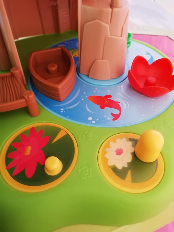 La cascade fantastique est aussi transportable grâce à sa poignée jaune. On peut l’emporter dans chaque pièce de la maison mais aussi jouer à l’extérieur ou chez papy/mamie pendant les vacances !