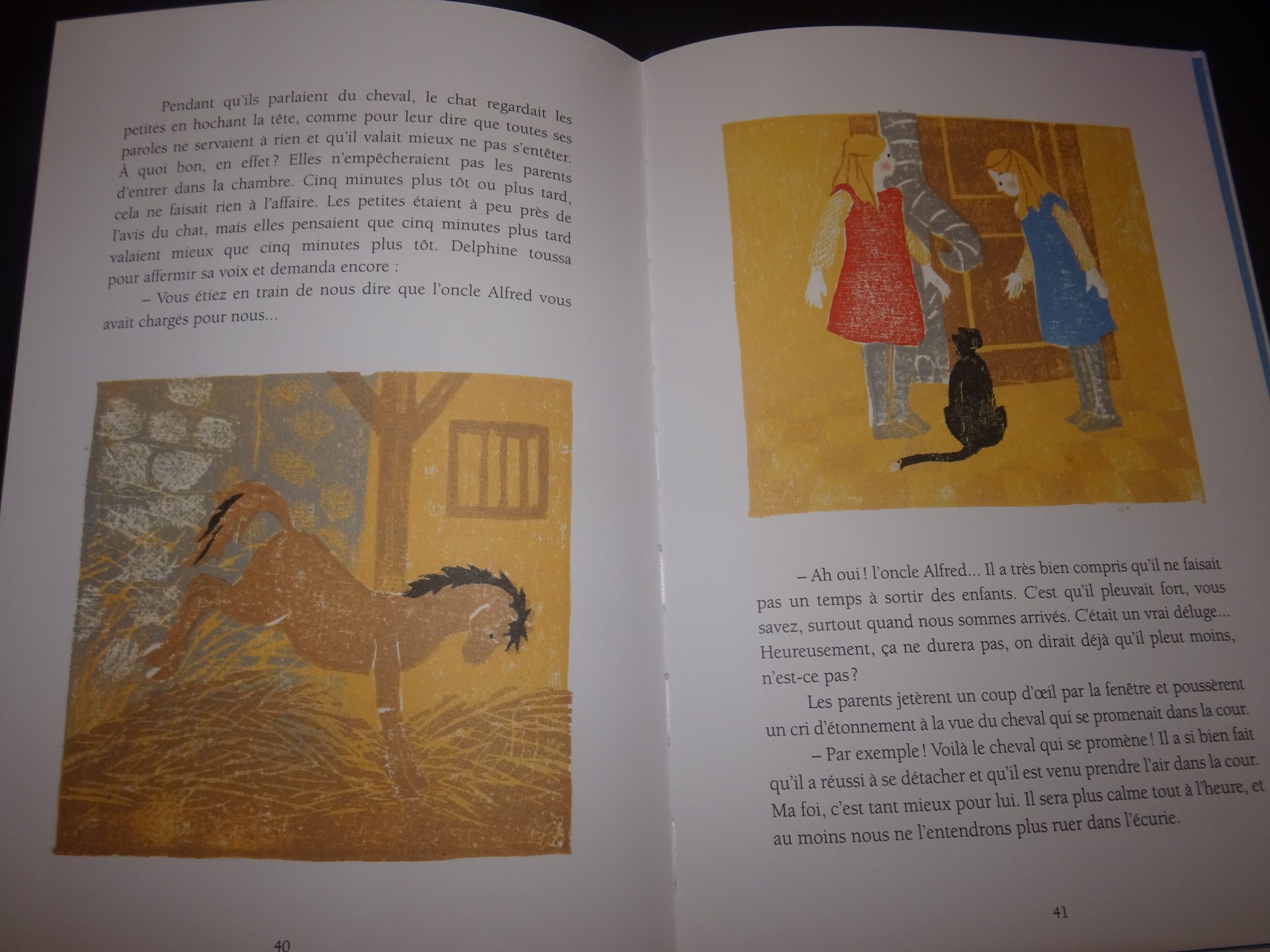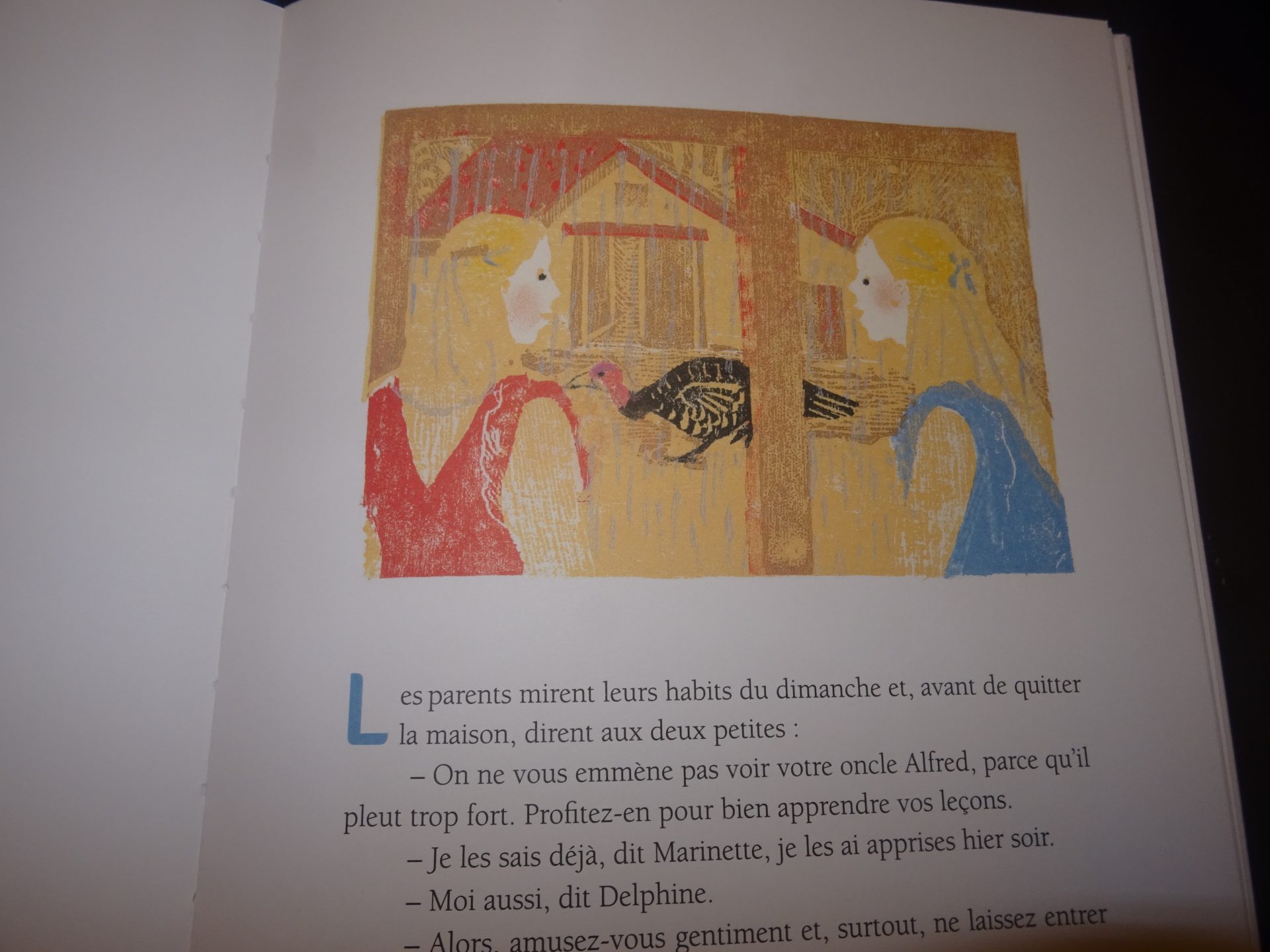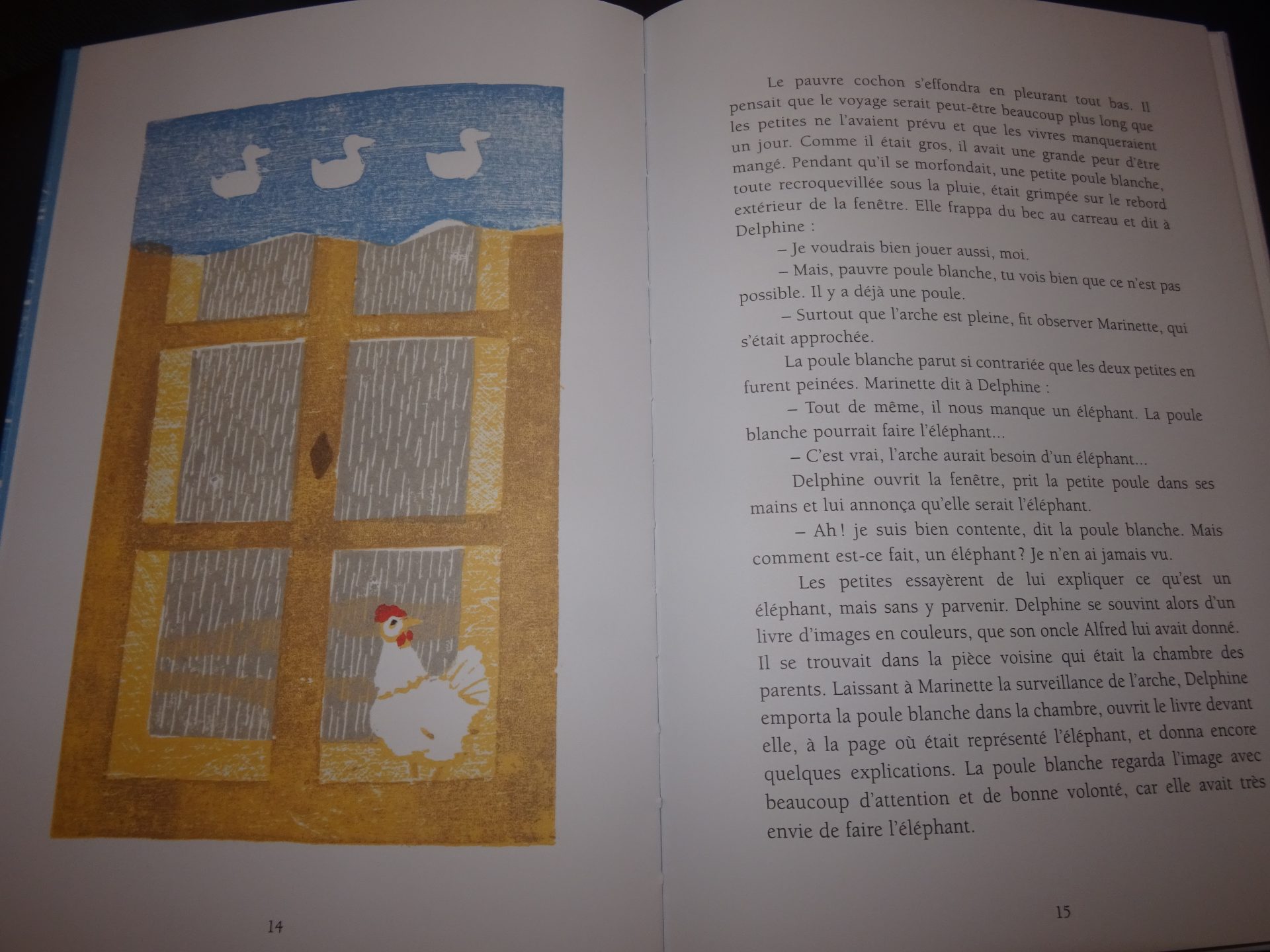 Synopsie : Par un jour de grosse pluie, les parents partent rendre visite à l’oncle Alfred en laissant Delphine et Marinette seules à la maison. Une seule consigne : ne laisser entrer personne. Mais dehors, le déluge est tel qu’il donne des idées aux fillettes : et si elles jouaient à l’arche de Noé ? Bientôt, tous les animaux de la ferme sont invités dans la cuisine, qui fait un excellent bateau. Le dindon, la poule, le chat, le cochon, la vache, le bœuf et le cheval font partie du périlleux voyage. Il ne manque plus qu’un éléphant…
