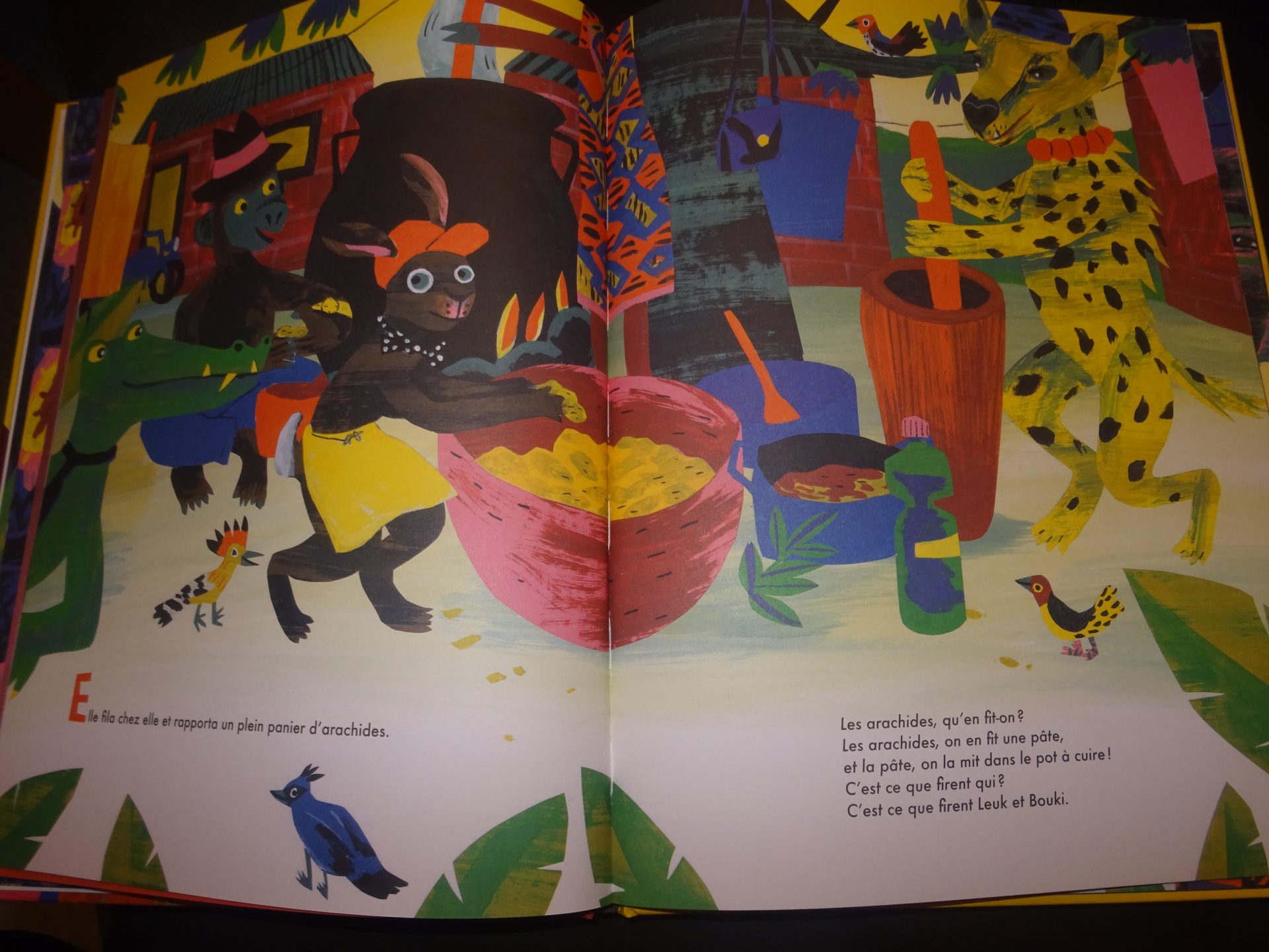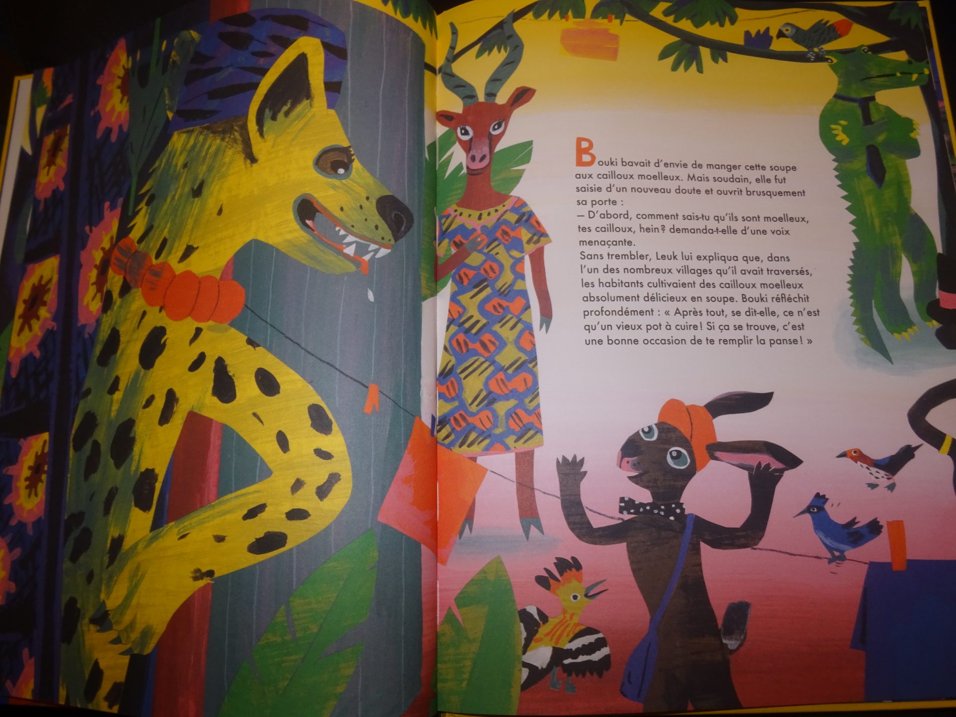 Apercevant sur sa route un village, il frappe à la porte de Bouki-l’hyène, gourmande et avare. À force de ruse, Leuk parvient à la convaincre de lui prêter son pot à cuire ni tout à fait sale, ni tout à fait propre pour y faire bouillir une succulente soupe aux cailloux moelleux. Un à un, l’éléphant, le léopard puis tous les habitants se joignent à eux en ajoutant un ingrédient à la soupe dont seul Leuk connaît le secret…