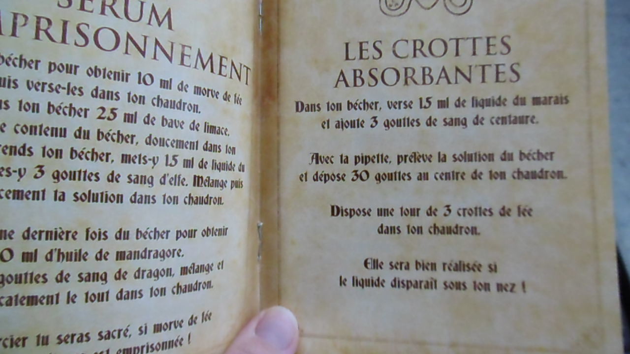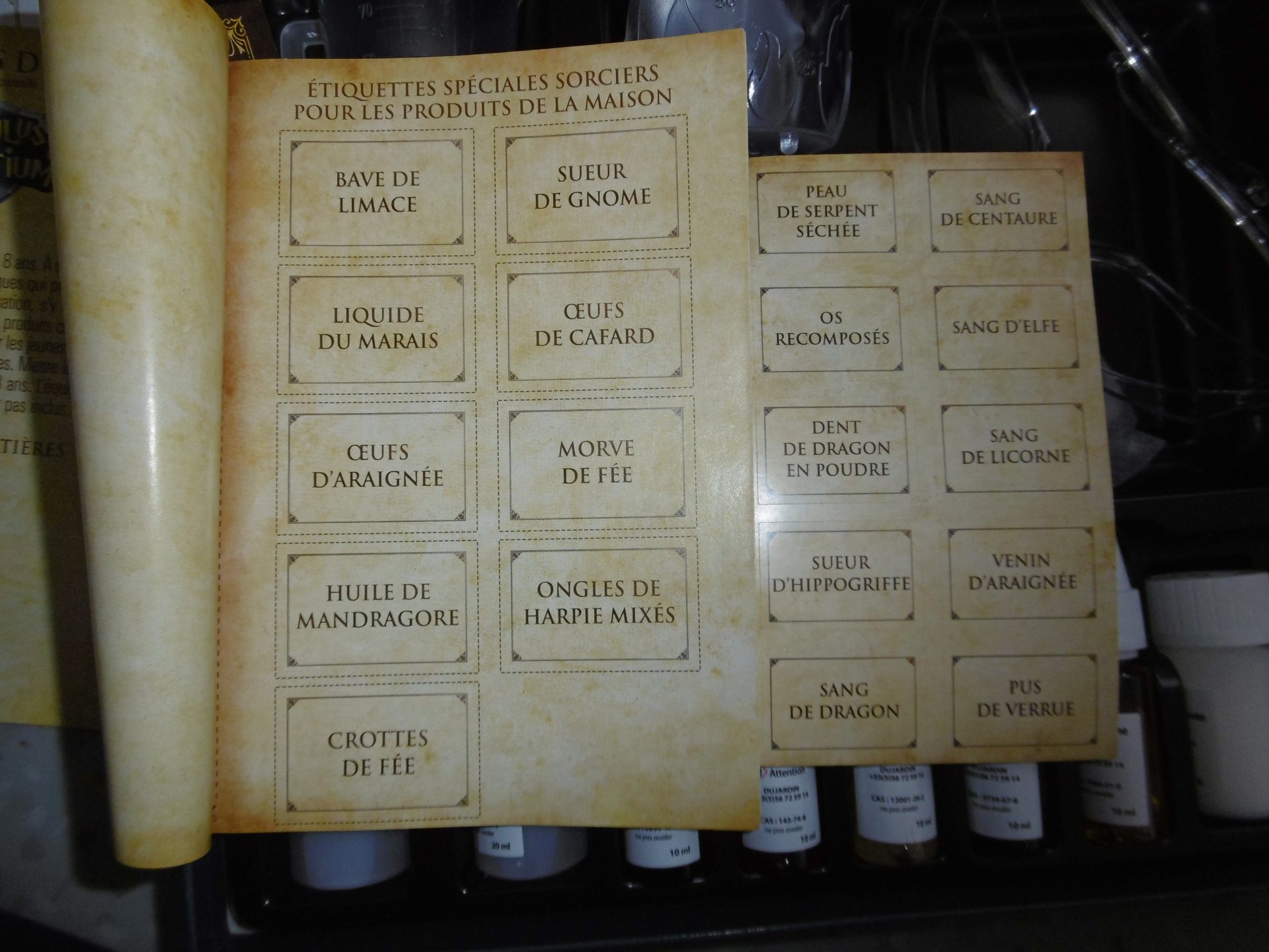 Le kit est complet avec tout le nécessaire pour jouer aux apprentis sorciers. Des étiquettes pour noter les potions réalisées, une notice avec le nom des ingrédients et surtout des recettes pour fabriquer ces potions.